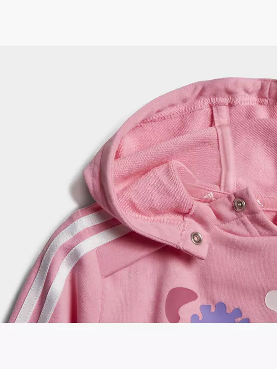 Die Dinos kommen! Dieser Jogginganzug für Babys und Kleinkinder ist mit den klassischen 3-Streifen und den verspielten Dinosauriern der perfekte Begleiter für kleine Abenteurer. Sowohl der Hoodie als auch die Jogginghose fühlen sich angenehm weich an. Sie sind locker geschnitten, damit es dein kleiner Schatz besonders gemütlich hat, während der elastische Bund für einfaches An- und Ausziehen sorgt und einen sicheren Sitz garantiert. Dieses Produkt besteht zu mindestens 70 % aus einem Mix aus recycelten und erneuerbaren Materialien. Unsere Baumwollprodukte unterstützen einen nachhaltigeren Baumwollanbau.